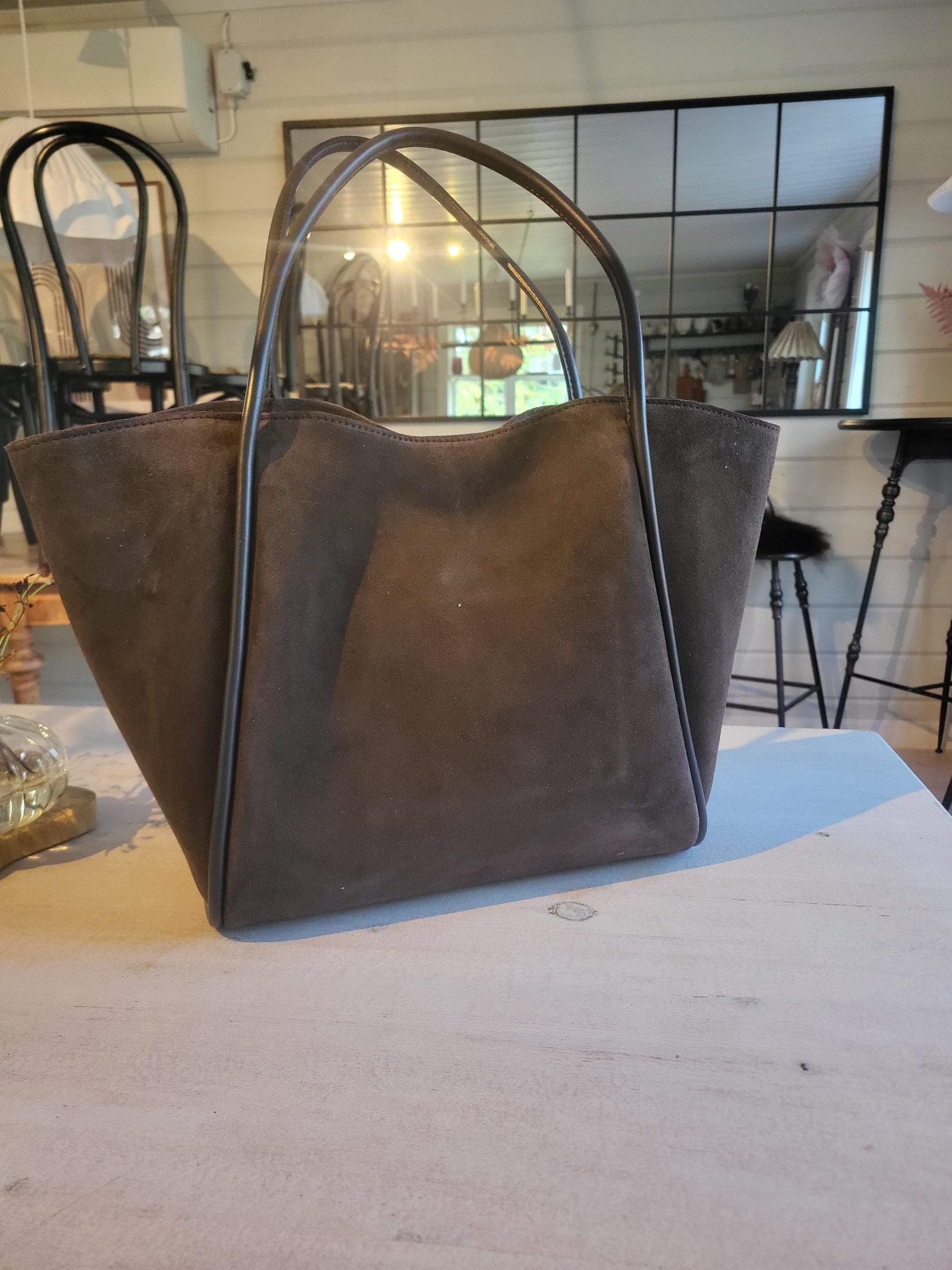 Stor väska i brun mocka. Handtag i mörkbrunt skinn. Har även en lång axelrem och en innerväska med dragkedja.