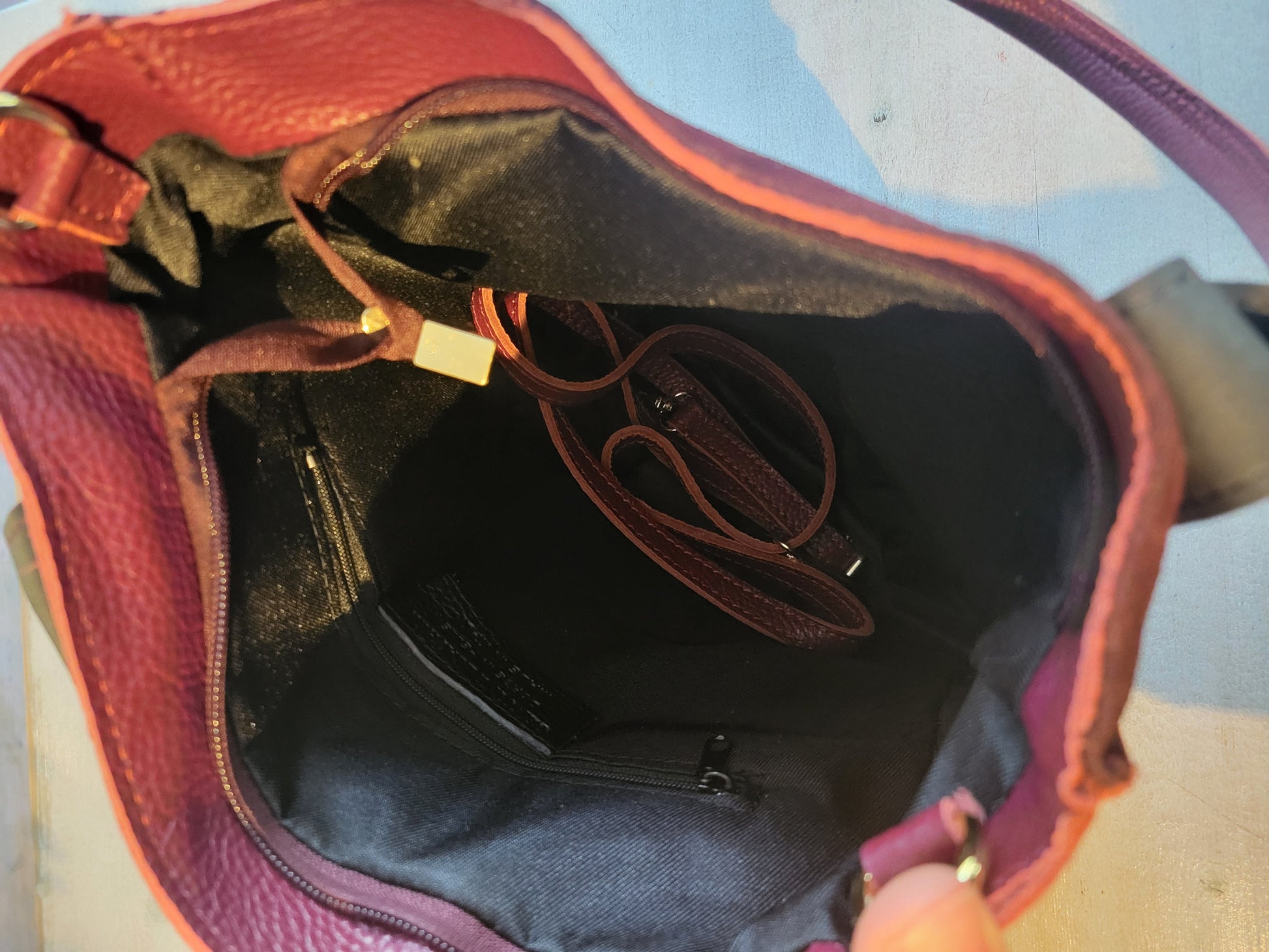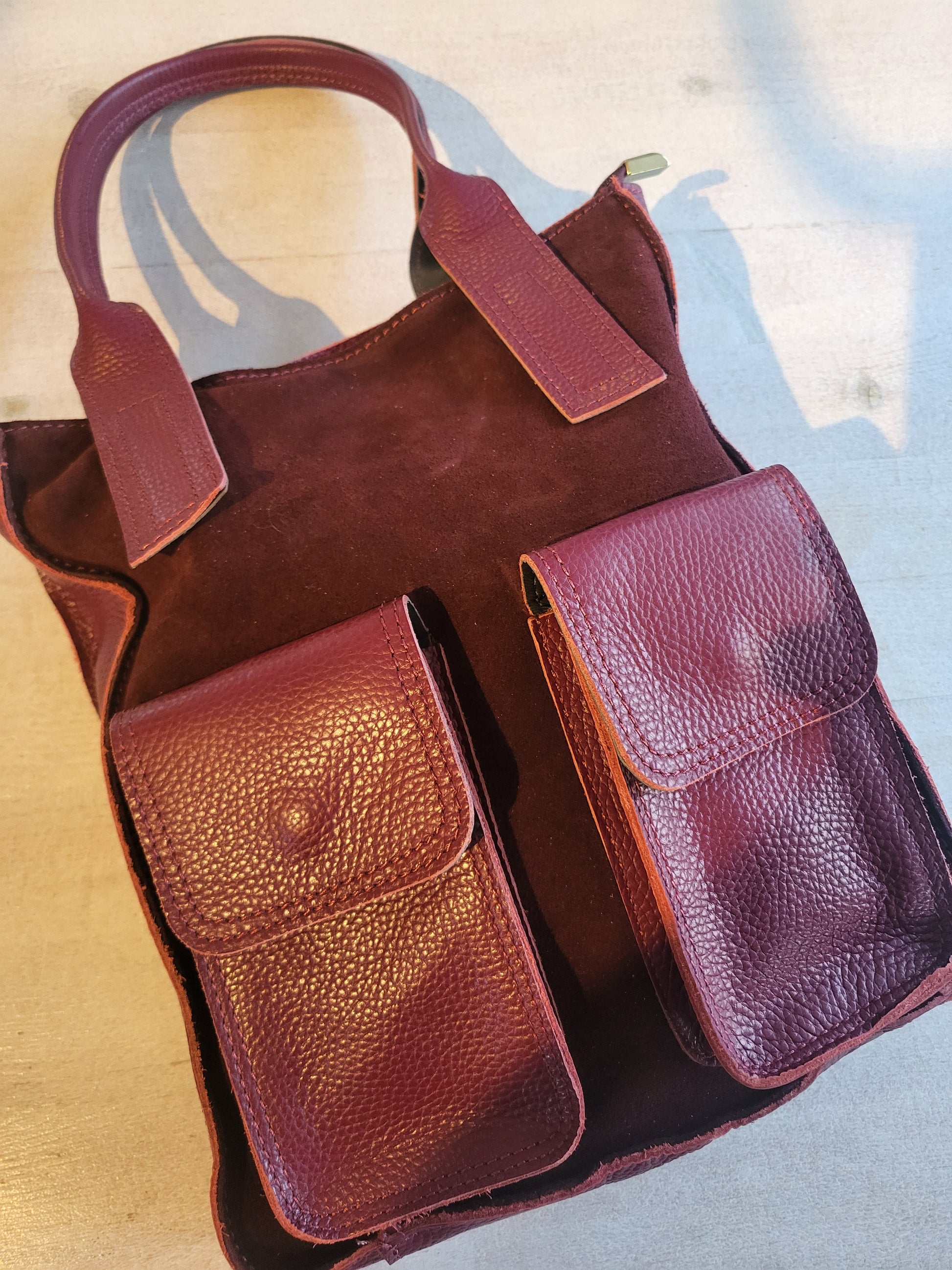 Skinnväska i mocka och skinndetaljer. Dragkedja och det finns även en lång axelrem i skinn. Två fickor fram med tryckknapp.