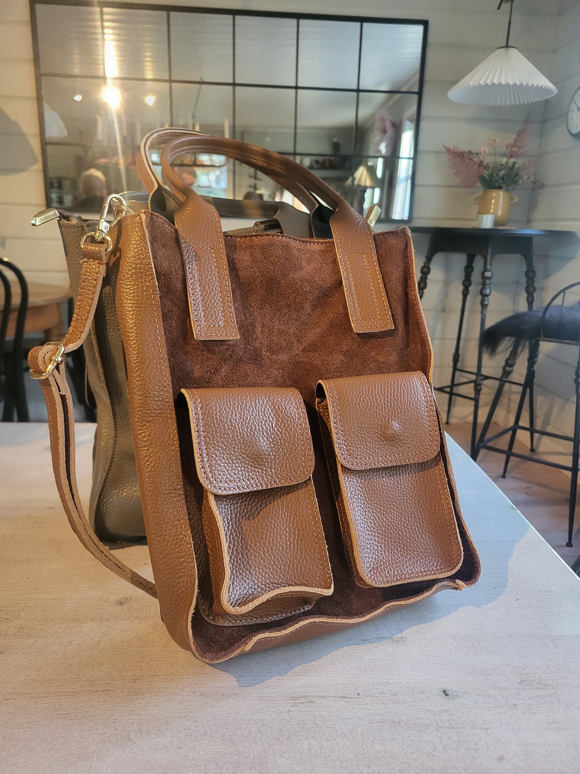 Skinnväska i mocka och skinndetaljer. Dragkedja och det finns även en lång axelrem i skinn. Två fickor fram med tryckknapp.